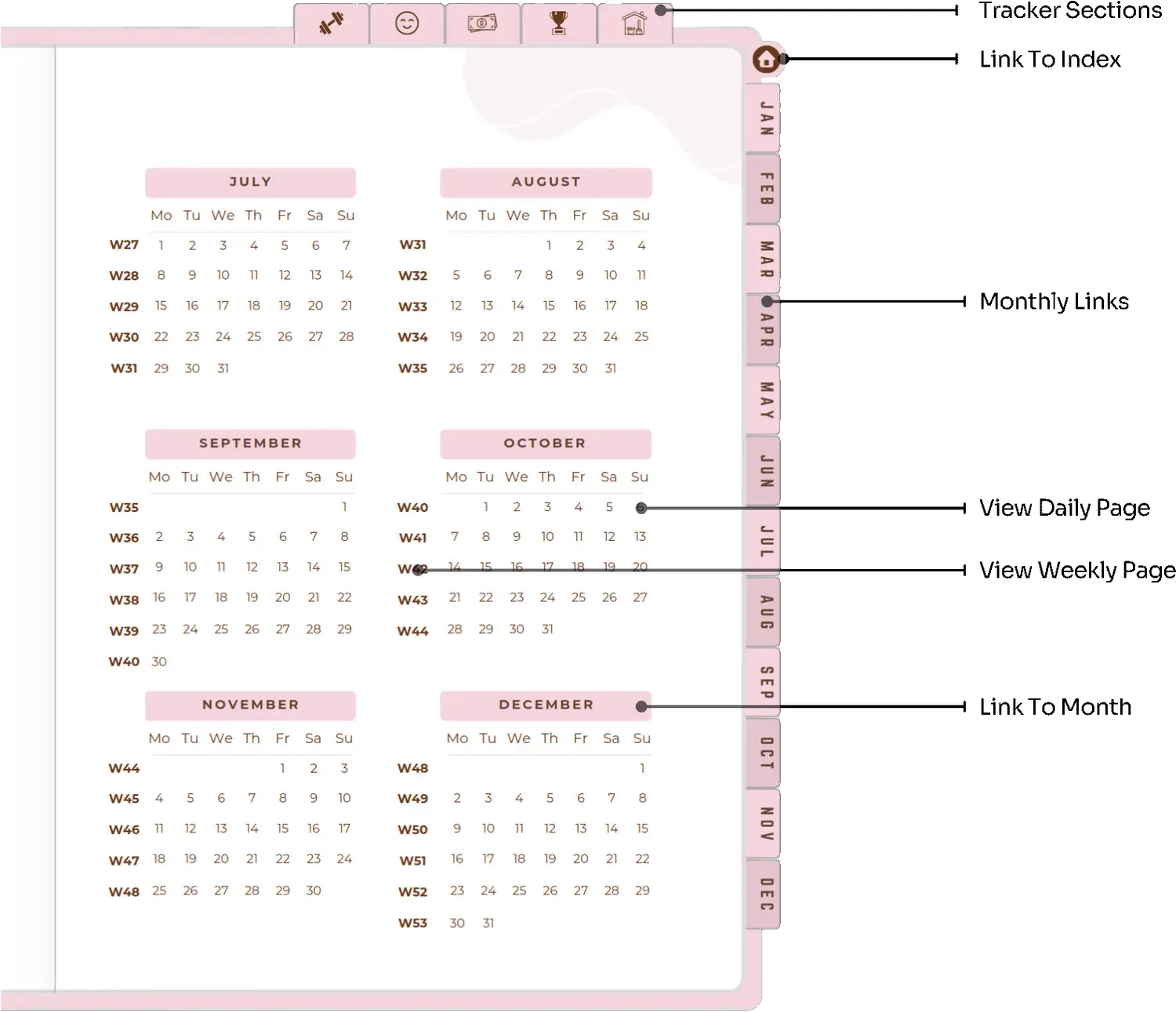 Seamlessly organize your months, weeks, and days with our feature-rich calendar, featuring thousands of hyperlinks for quick, easy access to all sections.